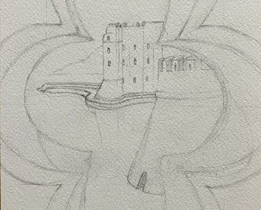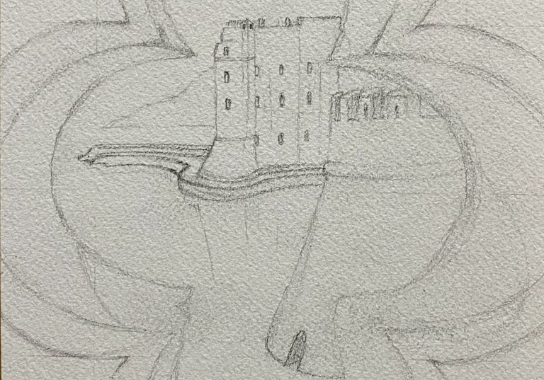 The work began with a measured graphite underdrawing, establishing proportion, structure, and spatial alignment before the introduction of colour.