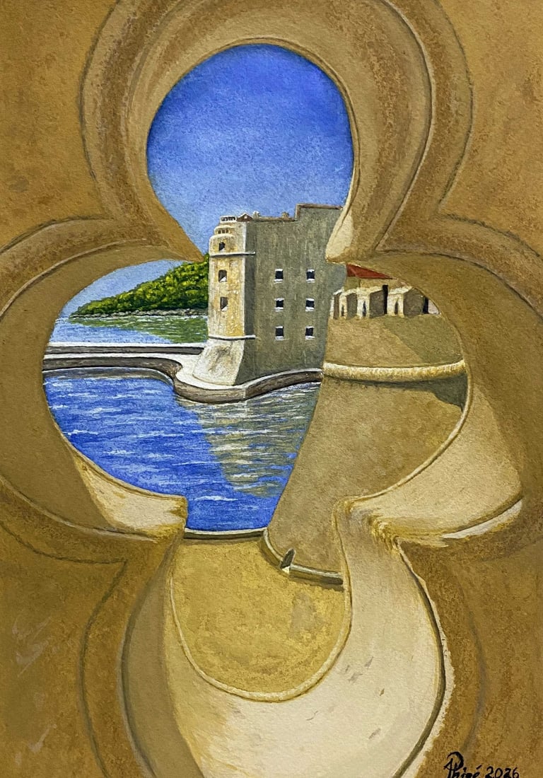 Through an aperture in the ancient city walls of Dubrovnik, the scene invites a pause to look outward toward the open Adriatic Sea.