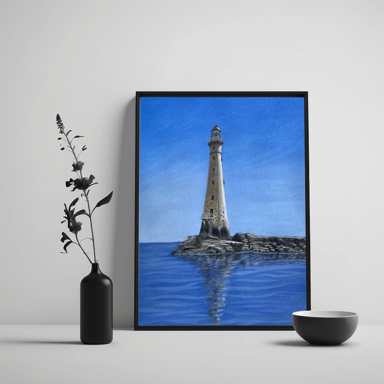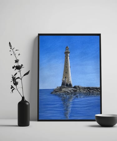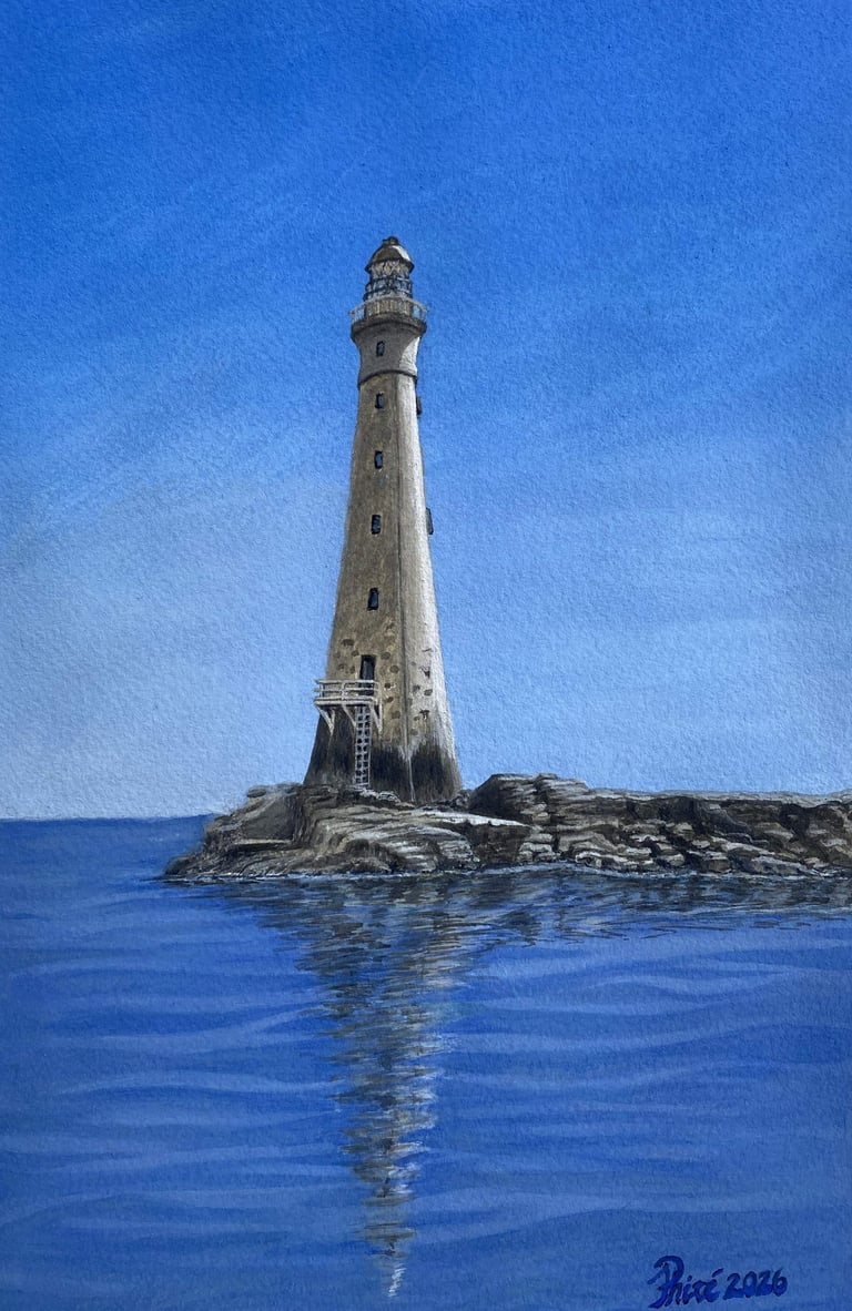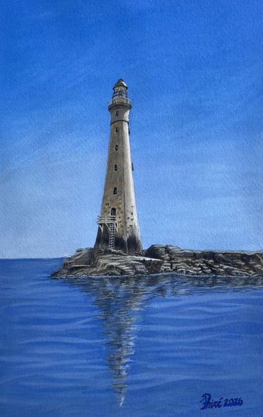 The Chicken Rock Lighthouse stands on a reef visible only for a few hours each day. Damaged by fire in 1960 and later restored, it remains in place. Observed from a fixed vantage point and stylised to convey stillness.