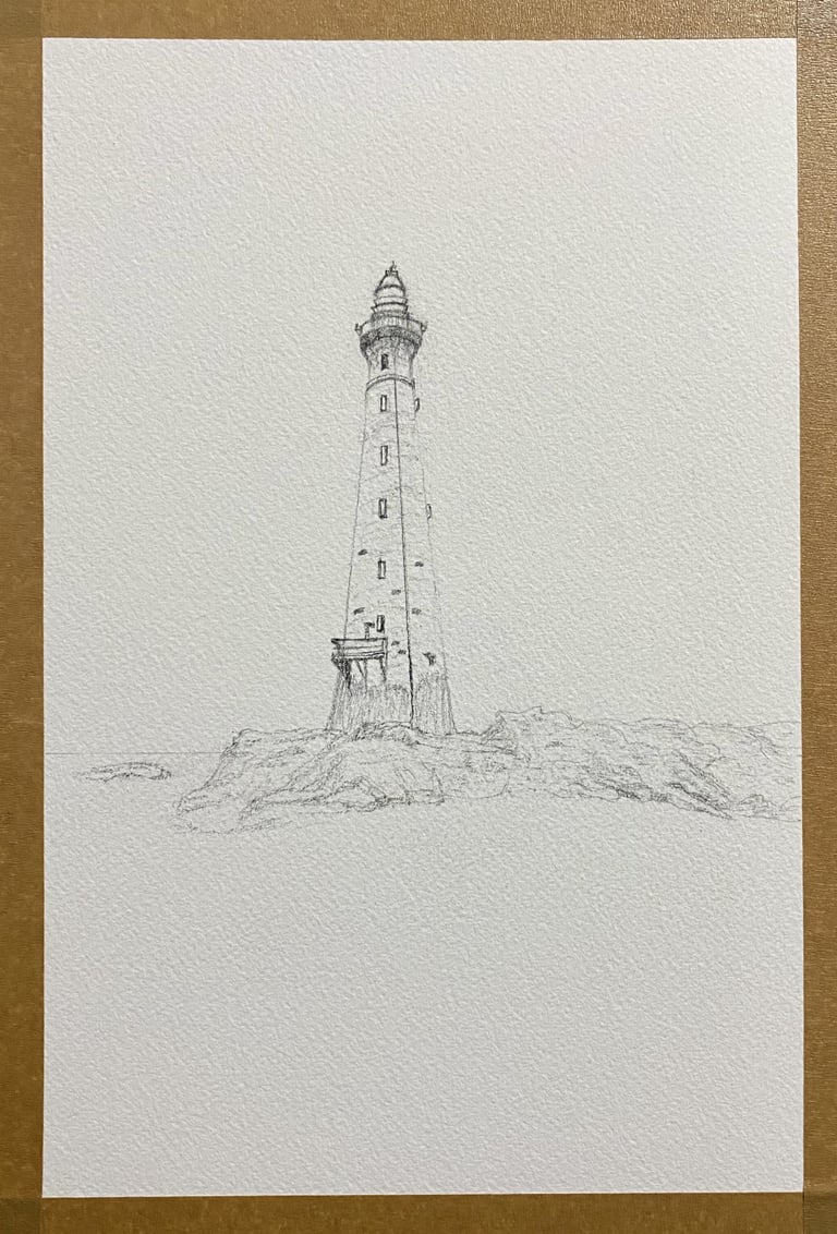 The work began with a graphite underdrawing to map out the intricate architectural details and perspective of the scene.