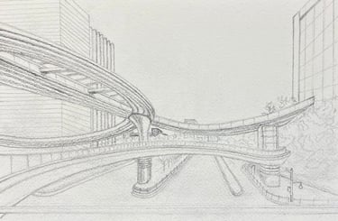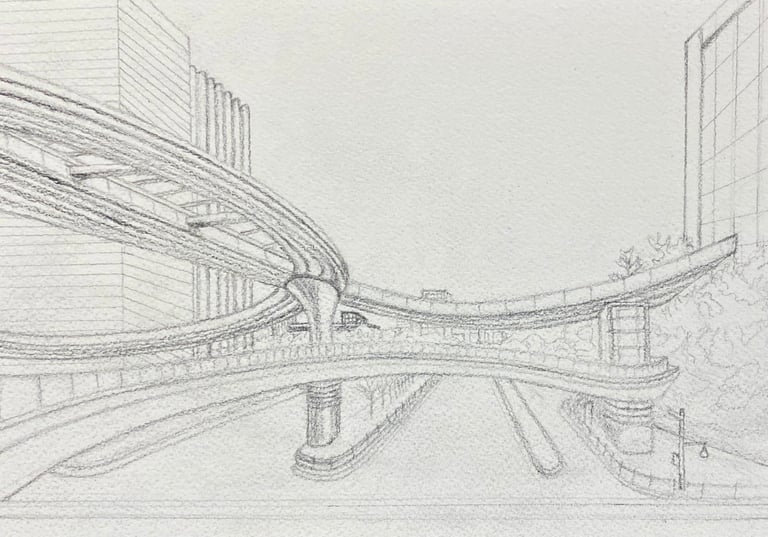 The work began with a measured graphite underdrawing, establishing proportion, structure, and spatial alignment before the introduction of colour.
