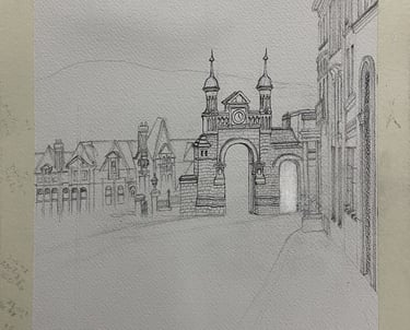 The work began with a measured graphite underdrawing to establish proportion, structure, and spatial alignment.